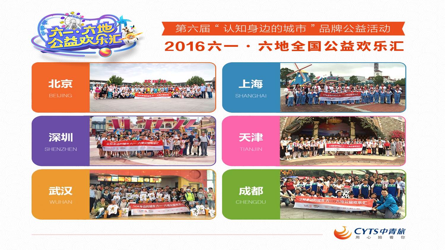 中国光大集团成员|2019世园会全球合作伙伴|品质生活系统提供者2011年中青旅专门为打工子弟师生们打造了公益旅行品牌—认知身边的城市,2015年以前都是针对北京打工子弟学校举办活动,2016年开始尝试与欢乐谷合作,在全国六地举办此公益活动,达到了空前的规模,也得到极好的反响。“认知身边的城市”作为面向城市边缘人群的项目,中青旅希望借助旅途中的互动,鼓励农村孩子们更加自信地分享欢乐,感受到这个城市的温暖,让旅行释放人间善意。